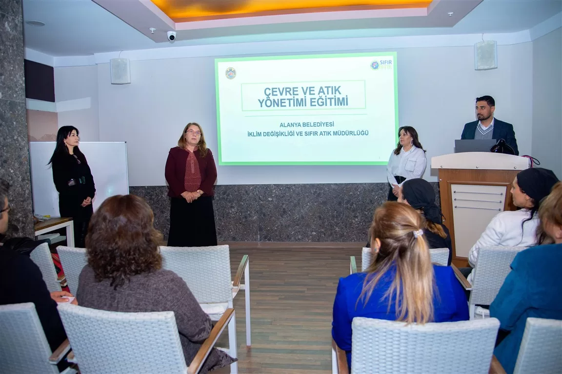Alanya Belediyesi İklim Değişikliği ve Sıfır Atık Müdürlüğü ile Temizlik İşleri Müdürlüğü iş birliğinde, otel ve restoran çalışanlarına yönelik sıfır atık eğitimi düzenlendi.