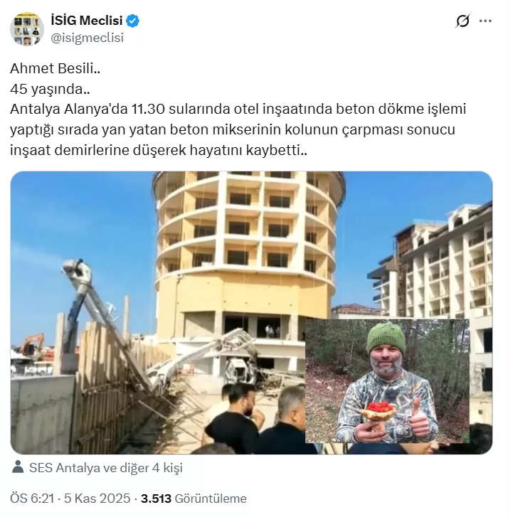 Antalya’nın Alanya ilçesinde bir otelin inşaatında beton dökümü sırasında beton mikseri devrilmesi sonucu çarptığı işçi Ahmet Besili demirlerin üzerine düşerek hayatını kaybetti.