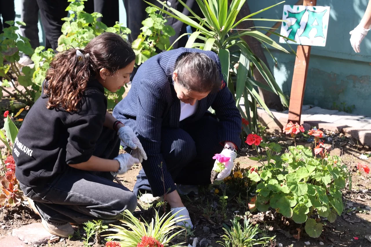 Etkinlik kapsamında okul bahçesinde oluşturulan hobi bahçesinde, Antalya Büyükşehir Belediyesi tarafından okula hediye edilen çiçeklerin öğrencilerle birlikte toprağa ekildiği paylaşıldı.
