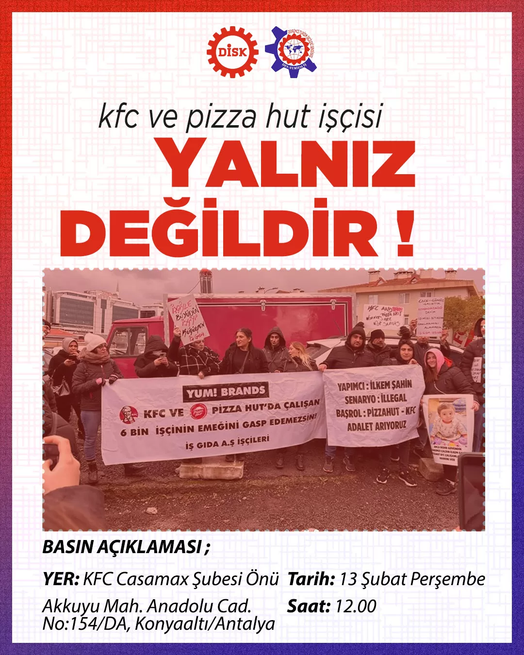 Yum Brands ile İş Gıda arasındaki anlaşmanın sona ermesiyle birlikte 6 binden fazla KFC ve Pizza Hut işçisi işsiz kaldı. Konuya ilişkin Dev Turizm-İş Antalya Şubesi 13 Şubat Perşembe günü basın açıklaması düzenleyecek