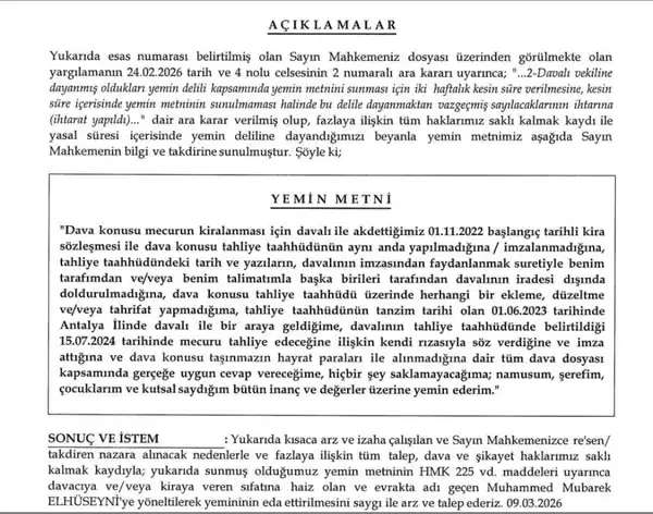 Müritlerin mahkemeye, Mübarek’e okutturulmak üzere tüm dava dosyası kapsamında gerçeğe uygun beyanda bulunulacağına dair kapsamlı bir yemin metni sunduğu aktarıldı. Metinde kira sözleşmesinin düzenlenme süreci, tahliye taahhüdünün aynı anda imzalanıp imzalanmadığı, belgelerde herhangi bir tahrifat yapılıp yapılmadığı, taşınmazın hangi koşullarda kullanıldığı ve mülkiyetin niteliğine ilişkin ifadelerin yer aldığı belirtildi.