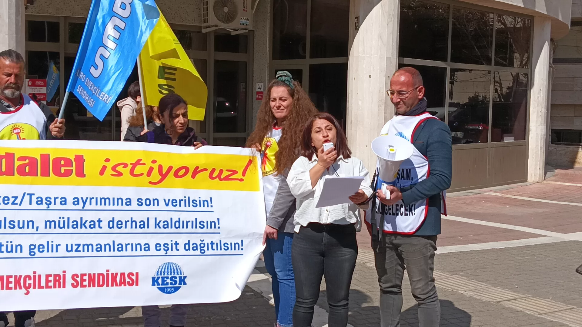 “Merkez taşra ayrımına son verilmelidir. Maliye emekçileri mali hizmetler sınıfı altında tanımlanmalı ve kurumda bozulan liyakat kariyer ilişkisi, mali hizmetler sınıfı içinde yeniden ele alınmalıdır. Uzun yıllardır kurum çalışanları içinde birbirinden farklı ücret skalaları oluştuğundan, kurumda iş barışı bozulmuş ve kurumda çalışan emekçilerin hem kurum aidiyeti ortadan kalkmış hem de emekçiler arasındaki dayanışma bozulmuştur. Bizler, bugün örgütlü bulunduğumuz bütün iş yerlerinde ve alanlarda, başta bütün emekçilerin yaşadığı yoksulluğa bir kez daha dikkat çekmek ve insan onuruna yaraşır bir ücret talep etmek ve yine gerek elde ettiğimiz ücretler üzerinden tevkifat yoluyla direk kesilen gelir vergisi haksızlığına, gerekse dünyanın en adaletsiz vergisi olan dolaylı vergilerin hane halkının temel ihtiyacı olan ürünlerde sıfıra indirilmesi talebiyle basın açıklamaları gerçekleştiriyoruz. İktidarı artık bir servet aktarma biçimini alan vergi adaletsizliğine son vermeye ve maliye emekçilerinin artık ertelenemez hale gelen sorunlarını çözmeye davet ediyoruz.”