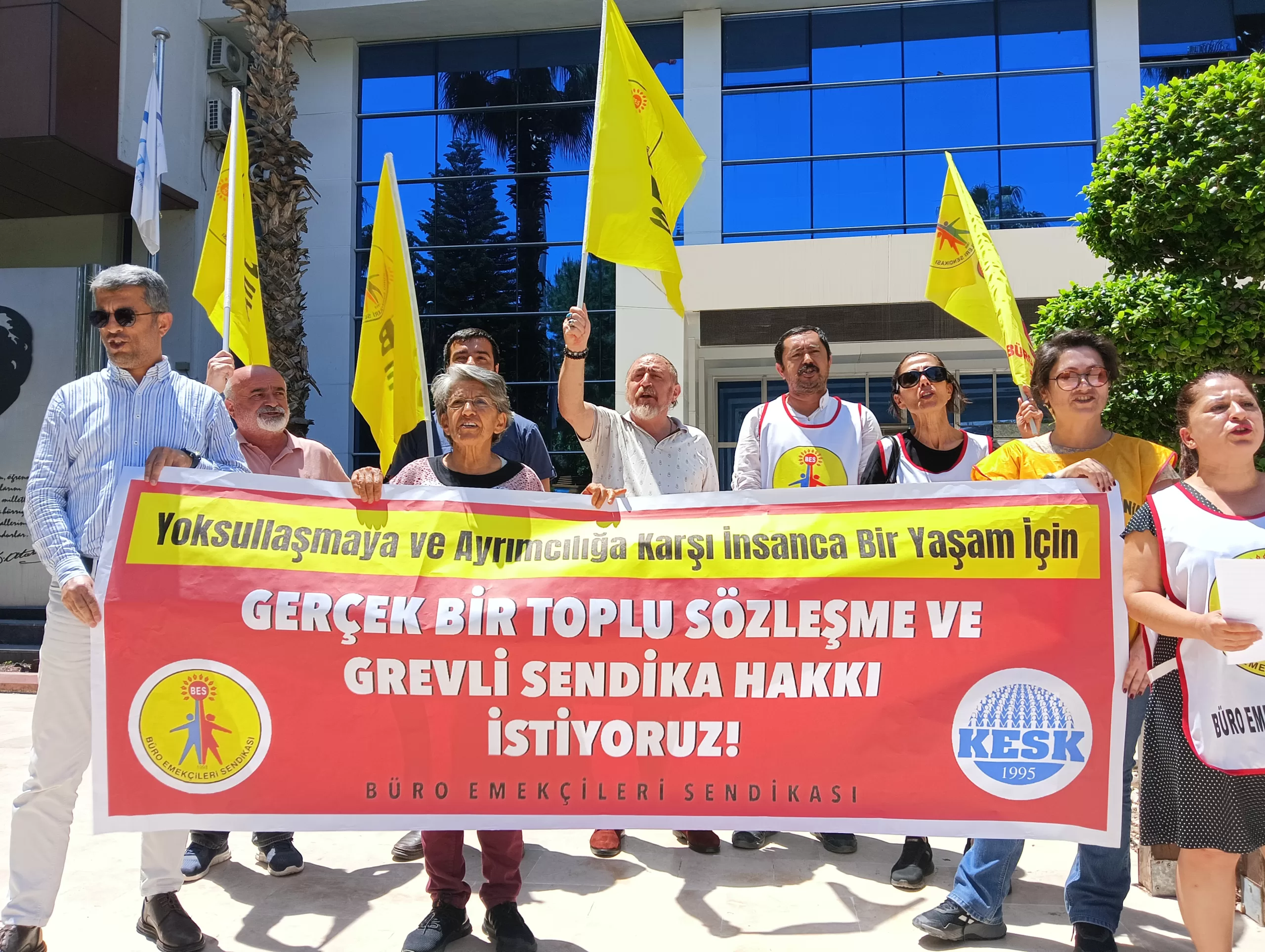 BES Antalya Şubesi, SGK İl Müdürlüğü önünde basın açıklaması yaparak TİS taleplerini açıkladı. Açıklamada, “Masa başı sendikacılığı ile değil grevle, direnişle mücadele ile haklarımızı kazanabiliriz” denildi.