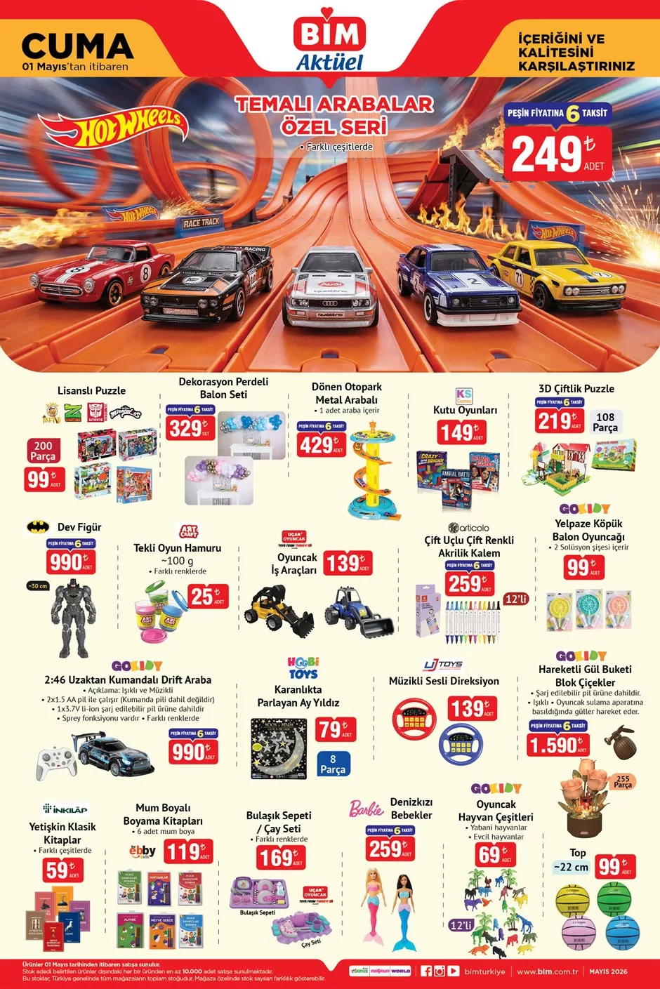 Oyuncak kategorisinde Hot Wheels temalı arabalar özel seri 249 TL fiyatla öne çıktı. Lisanslı puzzle ürünleri 99 TL, dönen otopark metal arabalı oyuncak 429 TL, kutu oyunları 149 TL, 3D çiftlik puzzle 219 TL, dev figür 990 TL, uzaktan kumandalı drift araba 990 TL olarak listelendi.