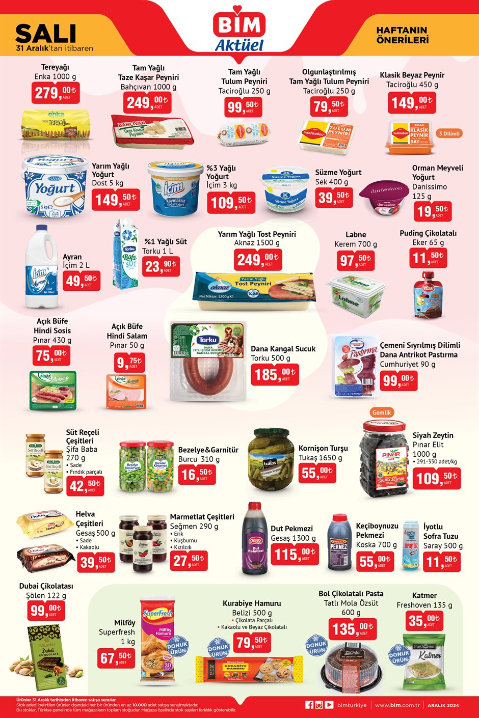 Bu haftanın lezzet dolu ürünleri sınırlı stoklarla BİM mağazalarında sizleri bekliyor. 31 Aralık Salı günü kaçırmamak için mağazaları ziyaret etmeyi unutmayın!