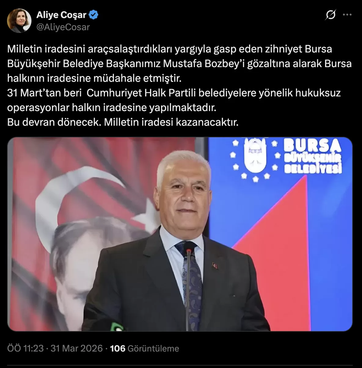 Cumhuriyet Halk Partisi (CHP) Antalya Milletvekili Aliye Coşar, Bursa Büyükşehir Belediye Başkanı Mustafa Bozbey’in gözaltına alınmasını “halkın iradesine müdahale” olarak nitelendirdi. Coşar, 31 Mart 2025 tarihinden bu yana CHP’li belediyelere yönelik gerçekleştirilen operasyonların hukuksuz olduğunu ifade etti.