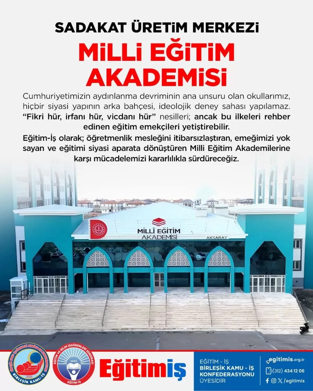 Acar açıklamasında; “Eğitim-İş olarak; öğretmenlik mesleğini itibarsızlaştıran, emeğimizi yok sayan ve eğitimi siyasi aparata dönüştüren Milli Eğitim Akademilerine karşı mücadelemizi kararlılıkla sürdüreceğiz” dedi.