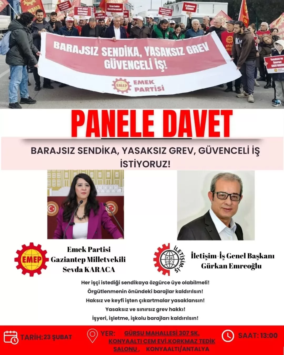 Emek Partisi (EMEP) Antalya İl Örgütü, Konyaaltı Cemevi Korkmaz Tedik Salonu’nda Emek Partisi Gaziantep Milletvekili Sevda Karaca ve İletişim İş Genel Başkanı Gürkan Emreoğlu’nun katılımıyla 23 Şubat Pazar günü bir etkinlik düzenliyor.