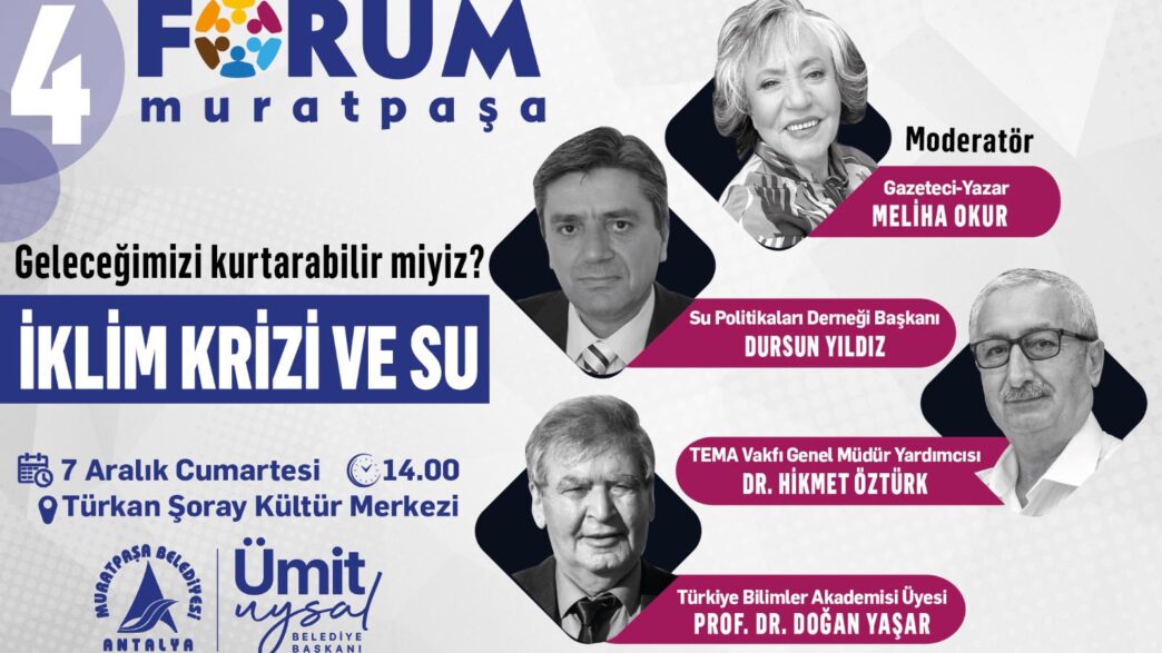 Muratpaşa Belediyesi’nin her ay farklı bir konuyu ele aldığı Forum Muratpaşa’nın aralık ayı gündemi, tüm dünyayı yakından ilgilendiren “İklim Krizi ve Su” olacak. Forum, 7 Aralık Cumartesi günü saat 14.00’te Türkan Şoray Kültür Merkezi’nde gerçekleşecek.