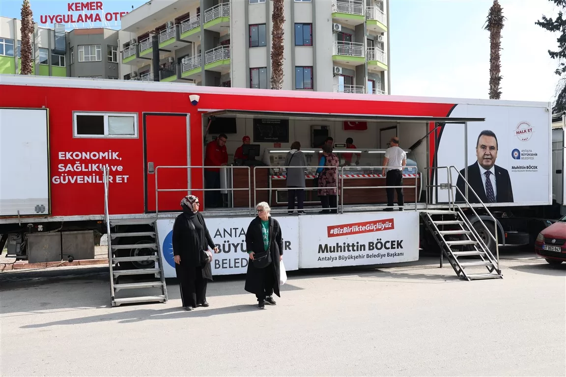 ANET Halk Et Satış Mağazaları’nda vatandaşlar uygun fiyatlı kaliteli et alma imkanı bulurken, Halk Et Mobil Satış Tırı ile bu hizmet Antalya’nın ilçelerinde yaşayan vatandaşların ayağına hizmeti götürülüyor. Halk Et Mobil Satı Tırı, pazartesi günü Kemer, salı günü Elmalı, çarşamba Korkuteli, perşembe Demre, cuma Kumluca, cumartesi Finike ve pazar günleri de Kaş ilçesinde vatandaşlara hizmet veriyor. Haftanın 7 günü kesintisiz hizmet veren Halk Et Mobil Satış Tırı gittiği her ilçede yoğun ilgi görüyor.