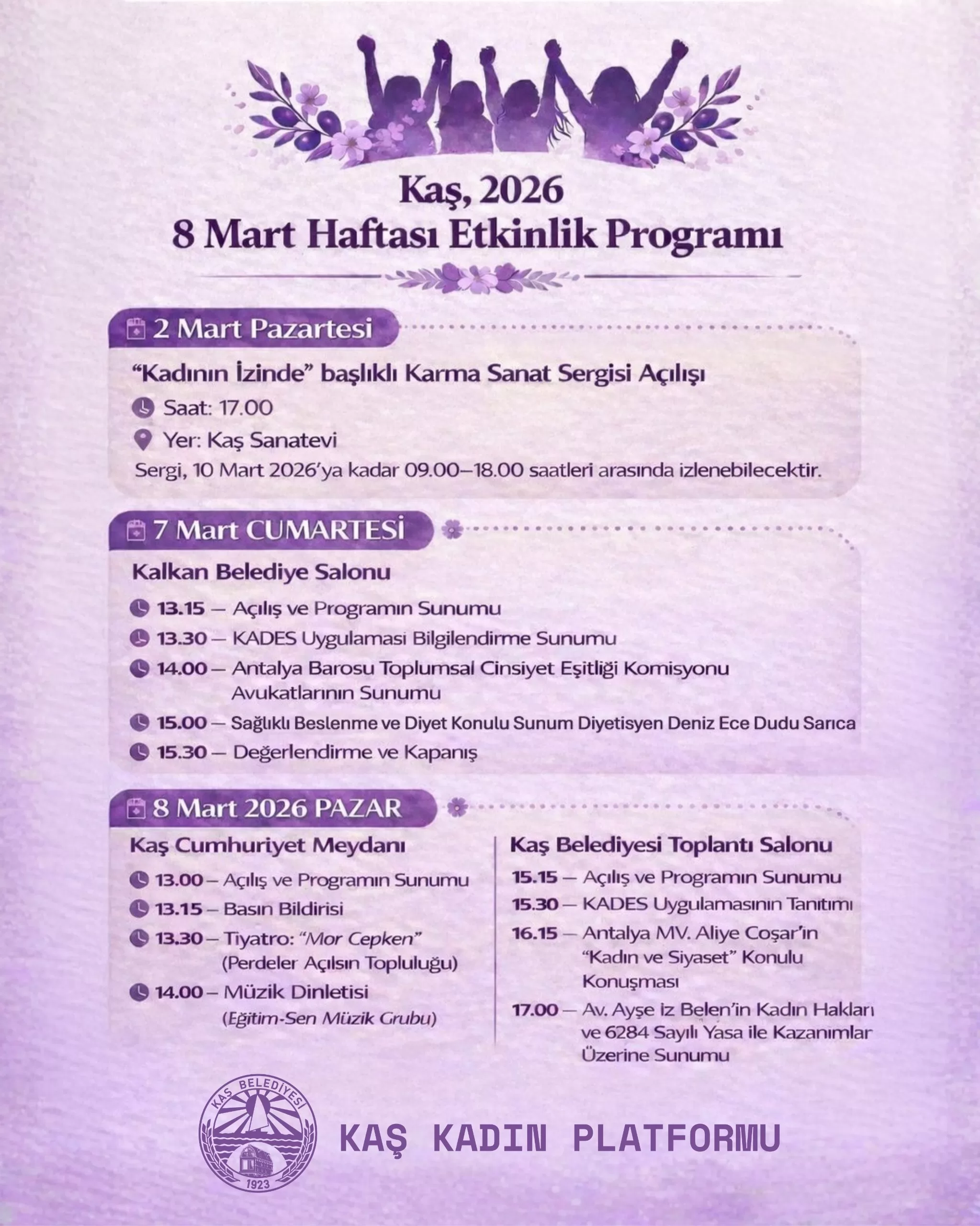 Kaş Belediyesi, 8 Mart Dünya kadınlar Günü kapsamında birçok etkinlik düzenleyecek. 7 ve 8 Mart tarihlerinde gerçekleşecek etkinliklerde basın bildirisi, tiyatro, müzik dinletisi ve sunum programları yer alacak.