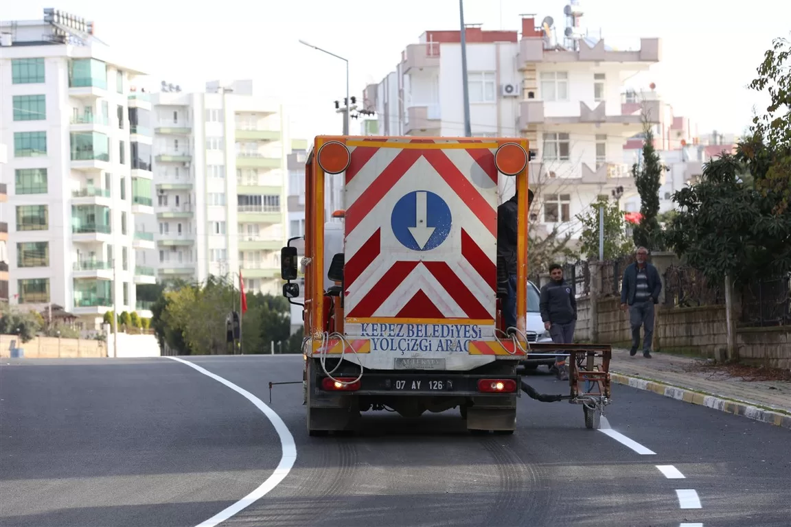 Kepez Belediyesi, sıcak asfalt serimi ve üstyapı çalışmalarının tamamlandığı yollarda trafik güvenliğini artırmak için yol çizgi çalışması gerçekleştiriyor. Ekipler, hava şartlarından dolayı yıpranan yol çizgilerini de yeniliyor.