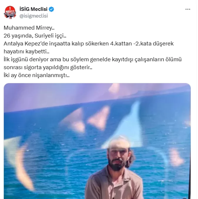 “Muhammed Mirrey. 26 yaşında, Suriyeli işçi. Antalya Kepez’de inşaatta kalıp sökerken 4.kattan -2.kata düşerek hayatını kaybetti. İlk işgünü deniyor ama bu söylem genelde kayıtdışı çalışanların ölümü sonrası sigorta yapıldığını gösterir. İki ay önce nişanlanmıştı”