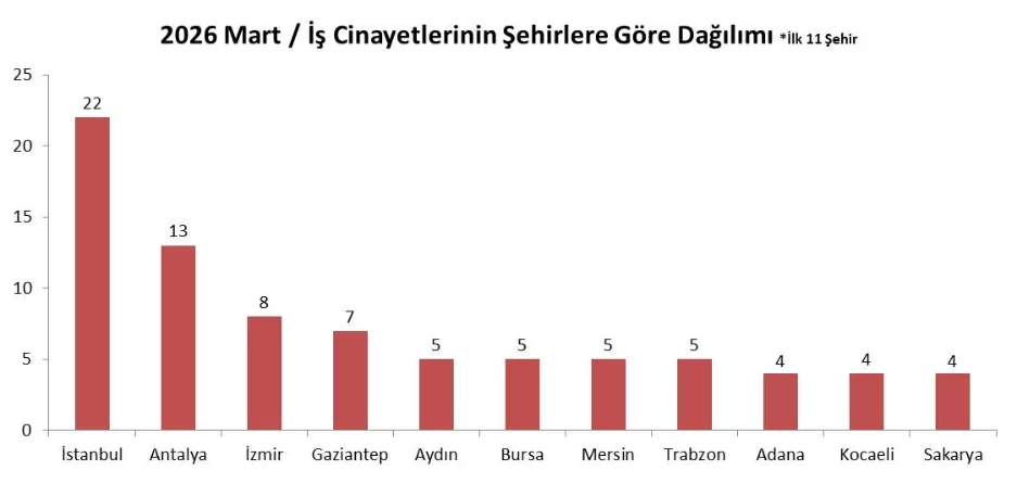 Rapora göre; Mart ayında Türkiye’nin 50 farklı şehrinde ve iş cinayetleri meydana geldiği tespit edildi. Ayrıca, kısa süreli çalışmak üzere yurt dışına üç ülkeye giden ya da Türkiye menşeili şirketlerde çalışan işçiler arasında da ölüm vakalarının rapor edildiği belirtildi.