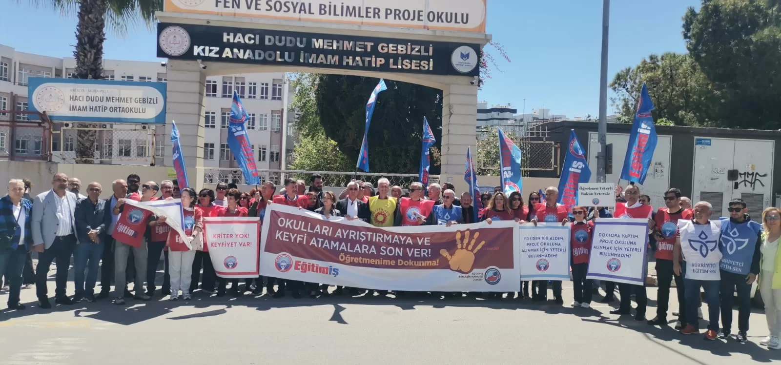 “Hacı Dudu Mehmet Gebizli Kız Anadolu İmam Hatip Lisesinde görev süresi dolan 58 öğretmenden 31’inin görev süresi uzatılmamış, meslektaşlarımız açıkta kalmıştır. Anlayış şu bizden değilseniz, bizim gibi düşünmüyorsanız değil bu okulda çalışmak yaşamaya bile hakkınız yok. Antalya’daki 89 proje okulunda görev yapan birçok öğretmen arkadaşımız hiçbir kriter olmaksızın okullarından uzaklaştırılmıştır. Bu sürecin mimarı, bugünün Milli Eğitim Bakanı Yusuf Tekin. Daha 2014 yılında, dönemin müsteşarıyken söylediği şu sözler bugün yaşadıklarımızın habercisiydi: “Mevzuatlar bize engel oluyor. Ama biz siyasi iradeyle hareket ediyoruz. Mevzuatlara rağmen bildiğimizi yapacağız ve yaptılar. Bugün öğretmenler kıyıma uğruyor, sürgün ediliyor. Okulların yıllardır oluşan iklimi darmadağın ediliyor. Öğrencilerin sınava aylar kala alıştığı öğretmenlerinden koparılması, eğitimde istikrarı yok ediyor. Bu bir proje değil, bir tasfiye operasyonudur. Bu itiraf, aslında bütün bu sürecin siyasi ve ideolojik bir projenin ürünü olduğunu göstermektedir. Proje okulları uygulaması ile bakan, 80 bine yakın öğretmeni doğrudan kendisi seçme ve atama yetkisini elinde toplamaktadır. Yani artık öğretmenlerin bilgi birikimi, başarı belgesi, akademik unvanı ya da hizmet puanı değil; bakanın onayı belirleyicidir. Bu da açıkça, mülakat düzeninin öğretmen atamalarındaki yeni biçimidir.”