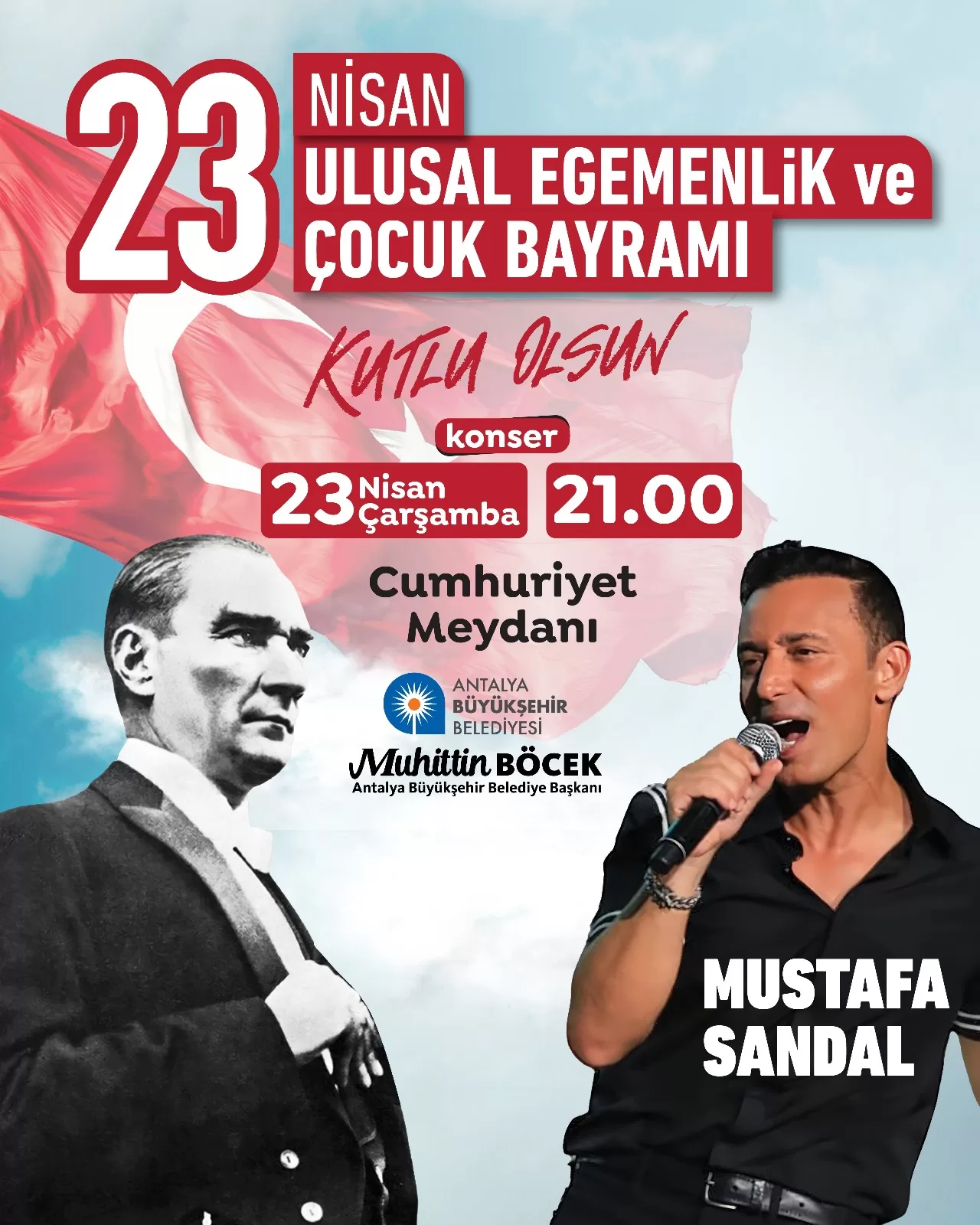 Kutlamalar Cumhuriyet Meydanı’nda saat 21.00’de düzenlenecek Mustafa Sandal konseriyle büyük coşkuya dönüşecek. Cumhuriyet Meydanını dolduracak on binlerce Antalyalı ünlü sanatçı Mustafa Sandal’ın şarkılarıyla unutulmaz bir gece yaşayacak.