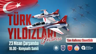 Antalya Büyükşehir Belediyesi Kültür ve Sosyal İşler Dairesi Başkanlığı tarafından hazırlanan kutlama programı kapsamında, 23 Nisan Çarşamba günü saat 18.00’de Antalya Valiliği iş birliğiyle Konyaaltı Sahili’nde Türk Yıldızları gösterisi gerçekleştirilecek. Türk Hava Kuvvetlerinin akrobasi timi Türk Yıldızlarının nefes kesecek gösterisi 23 Nisan kutlamalarına renk ve heyecan katacak.