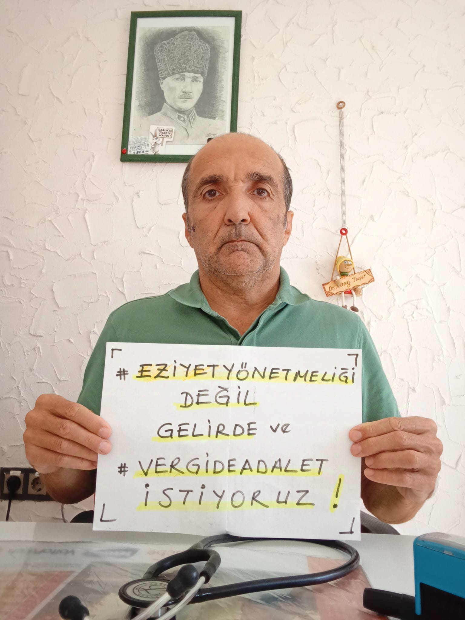 “Bugün 30 Ekim 2024 Çarşamba. 34 haftadır vergide adalet talebimiz için ses çıkarmaya devam ediyoruz. Sadece vergide adalet için değil sağlıkta çeteleşmeye, ticarileşmeye, sağlık çalışanına durmak bilmeyen şiddete ve bunu besleyen aile hekimliğinde eziyet yönetmeliği gibi baskıcı mevzuat ve uygulamalara karşı mücadele ediyoruz”