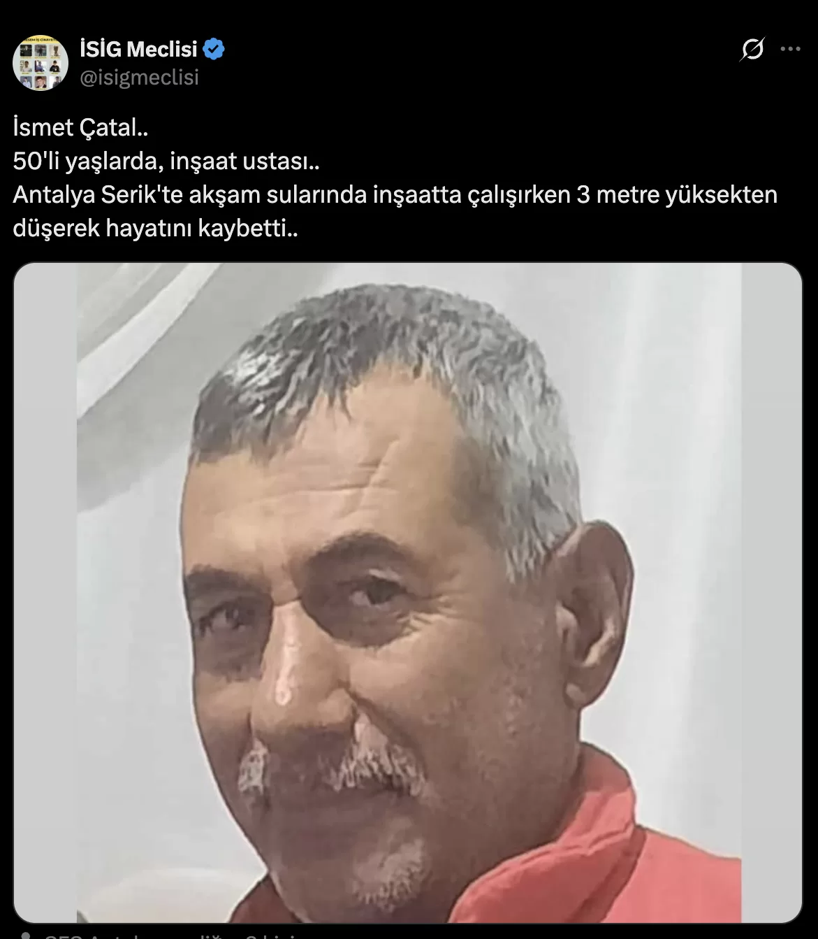 “İsmet Çatal.. 50’li yaşlarda, inşaat ustası.. Antalya Serik’te akşam sularında inşaatta çalışırken 3 metre yüksekten düşerek hayatını kaybetti..”