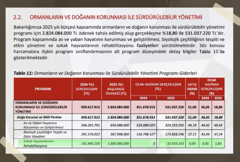 Açıklamada, Tarım ve Orman Bakanlığı’nın 2025 Yılı Kurumsal Mali Durum ve Beklentiler Raporu verilerine göre, sokakta yaşayan hayvanlar için tahsis edilen 1 milyar 800 milyon liralık kaynaktan sadece 32 milyon 925 bin 333 liranın kullanıldığı belirtildi.
