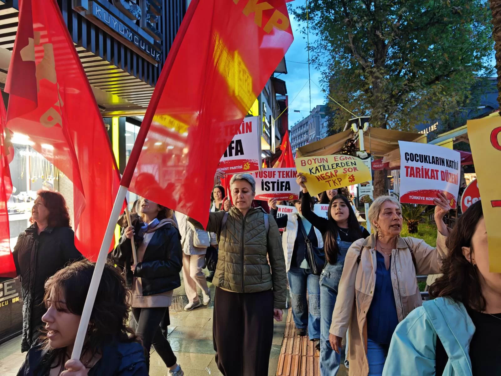 Yürüyüşte “Çocuklarımızı Korumak İçin Bu Düzeni Yıkacağız” pankartı taşındı, “Boyun eğme katillerden hesap sor”, “Yusuf Tekin istifa“, “Öğretmen katili çete düzeni“, “Çocuk katili tarikat düzeni”, “Karanlığa boyun eğmeyeceğiz” sloganları atıldı.